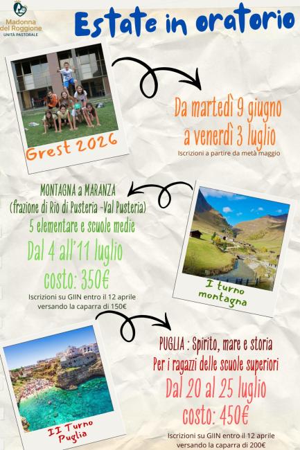 Consapevoli delle difficoltà organizzative nel pianificare l'estate, tra vacanze scolastiche, ferie lavorative e prenotazioni da effettuare con mesi di anticipo, anche in seguito alle richieste avanzate da alcuni genitori, pubblichiamo in anticipo le date delle attività estive promosse dall'Oratorio di Pizzighettone e dalla Pastorale Giovanile Interparrocchiale per bambini, ragazzi e adolescenti. ​​​​​​